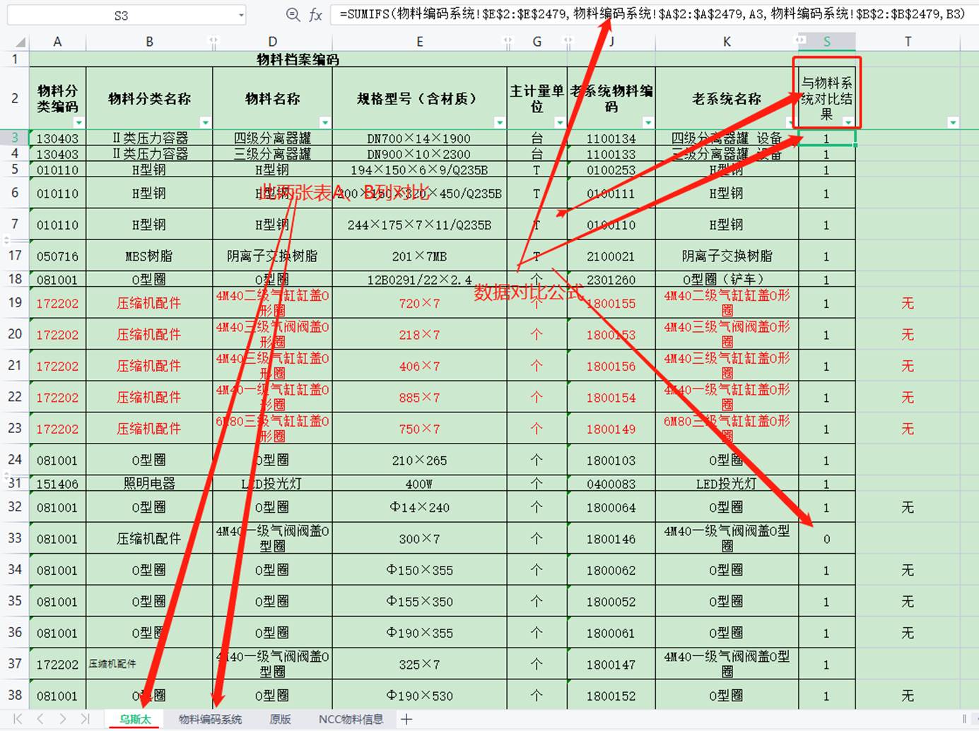 在結果值返回表(烏斯太)中設公式:S3=SUMIFS(物料編碼系統!$E$2:$E$2479,物料編碼系統!$A$2:$A$2479,A3,物料編碼系統!$B$2:$B$2479,B3)。